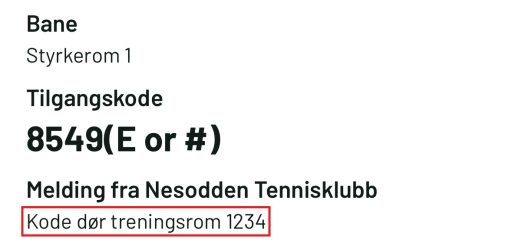 Koden til hallen er tilgjengelig 30 minutter før bookingen starter og tastes inn på det runde hvite kodepanelet til venstre for inngangsdøren. Koden til styrkerommet tastes inn på dørhåndtaket til styrkerommet.