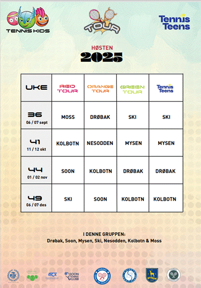 TennisKids og TennisTeens turneringene startet opp igjen 6-7. september og neste runde er 11-12 oktober. Da arrangerer vi Orange tour på Nesodden så alle som spiller med oransje ball må melde seg på der 😊 Samme helg er det Red tour for de med røde baller i Kolbotn og Green tour og Tennis Teens i Mysen. Påmelding her;
